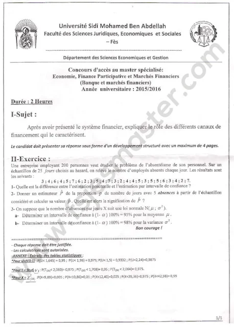 Exemple Concours d'accès au Master Economie Finance Participative et Marchés Financiers (Banques et Marchés Financiers) 2015-2016 - Fsjes Fès